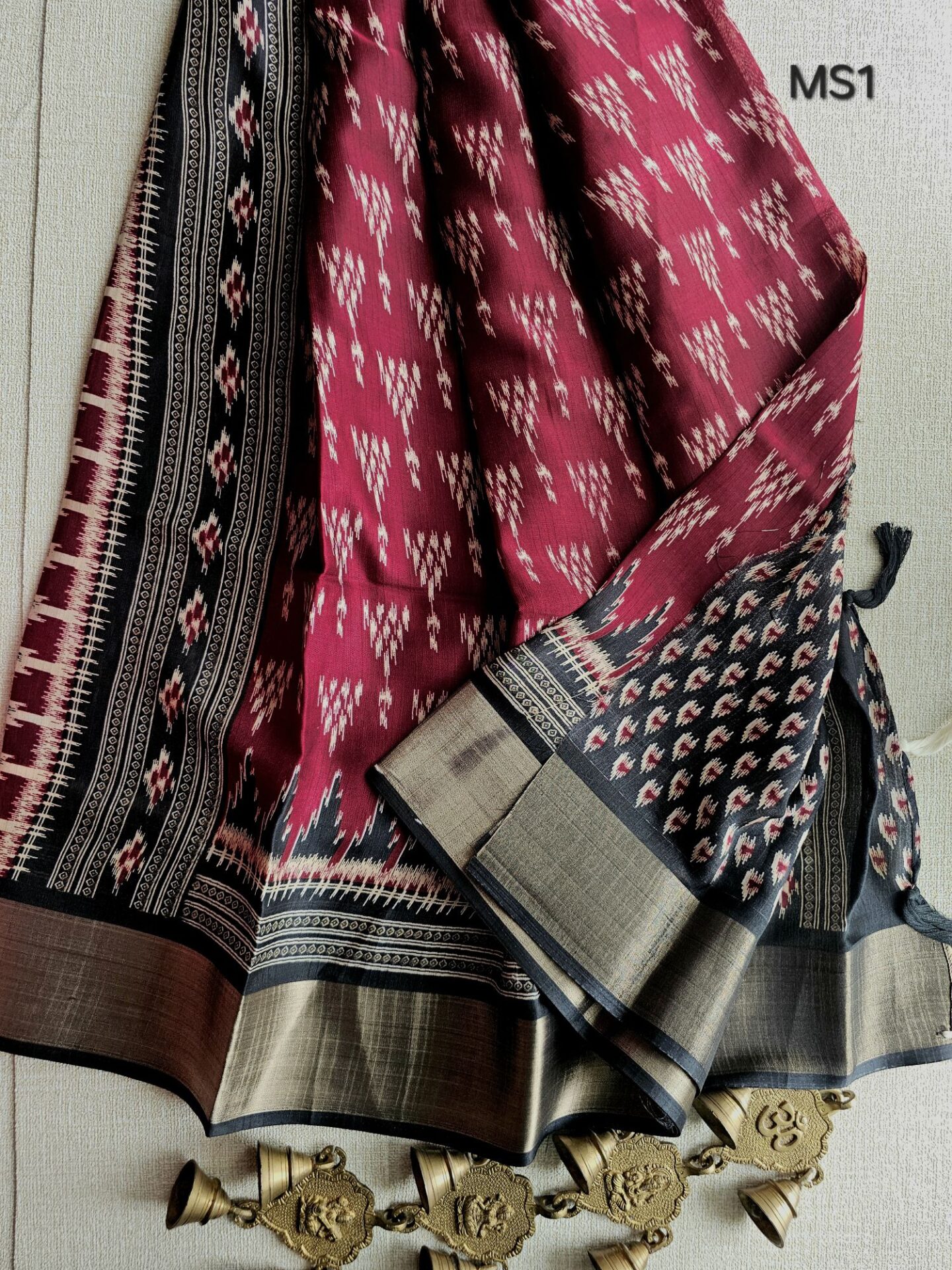Pallu: contrast printed pallu with tassel finish for a graceful shoulder line